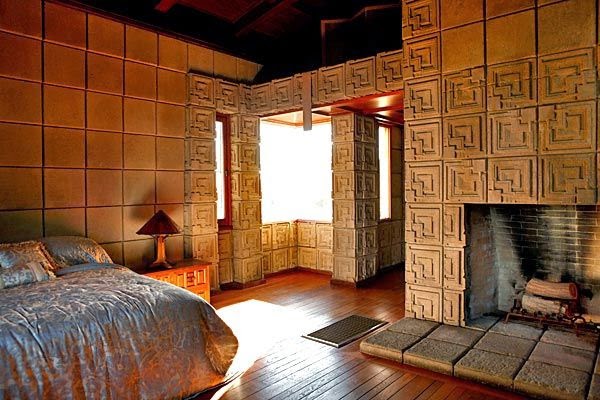 Located in Los Feliz, the Ennis House was designed by Frank Lloyd Wright and built in 1924. Drawing inspiration from Mayan temple architecture, it is constructed of pre-cast concrete blocks. One of a number of houses Wright designed in L.A. during this period using the cement block technique, the structure is reinforced with metal bars. Because of the larger budget of the owners it's also on of the largest built with this method. Typical of Wright's style, it is designed to embrace the land it's constructed on. The building is foreign and unusual looking for the time, but also features familiar elements of art nouveau style with metal scrollwork and stained glass.